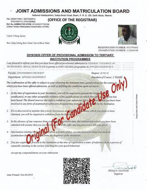 Unified Tertiary Matriculation Examination Admission Letter