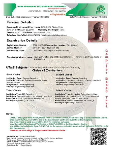 Unified Tertiary Matriculation Examination Registration slip