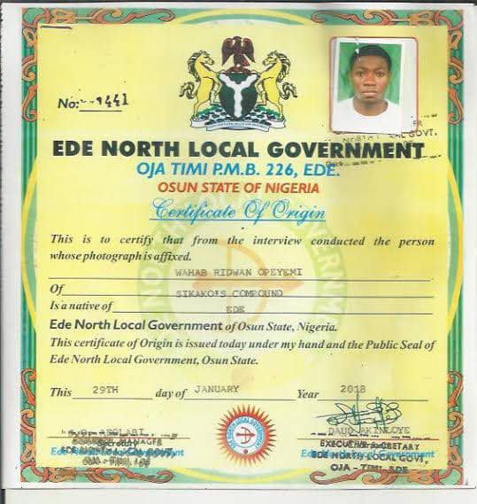 State Of Origin certificate/Local government identification