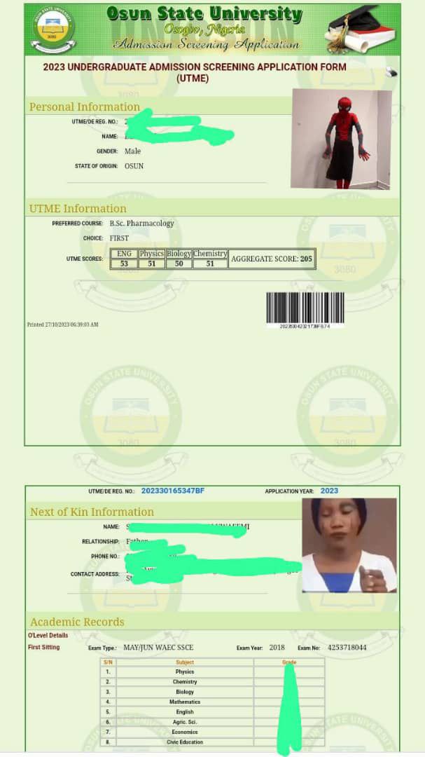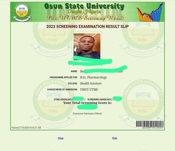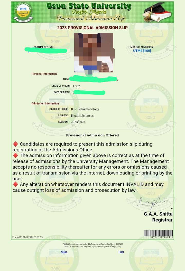 Osun State University Provisional Admission Slip